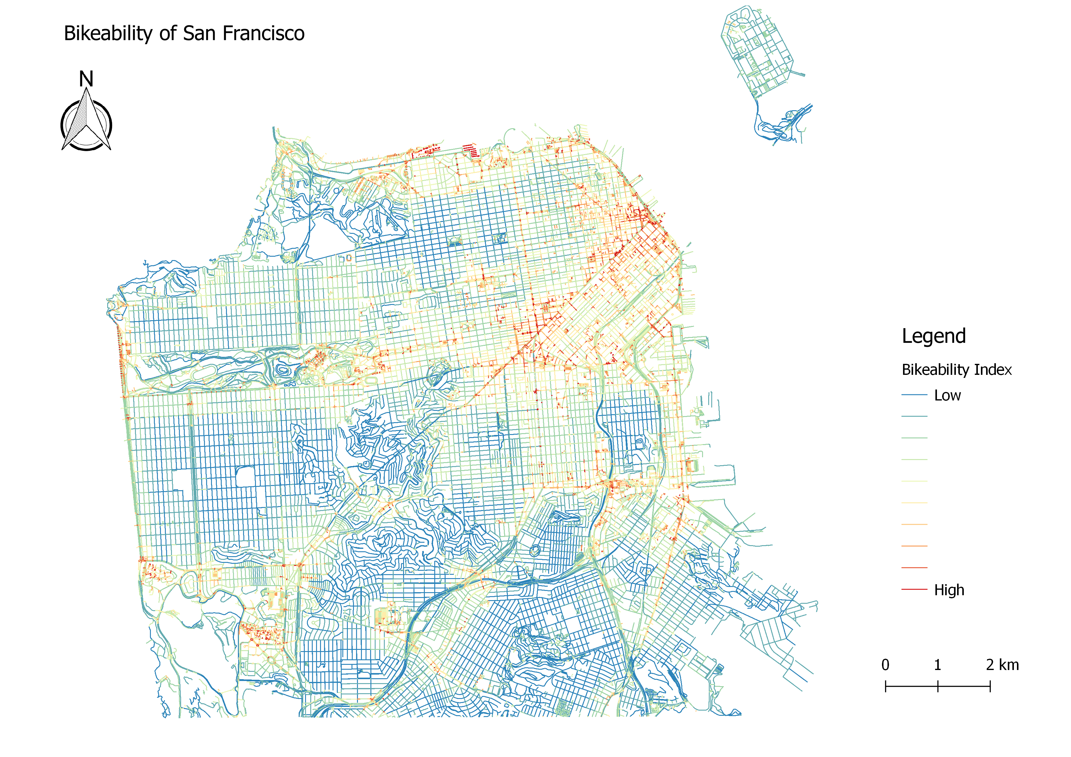 Figure 2 below was generated to visualize the bikeability of San Francisco using the methods described above.