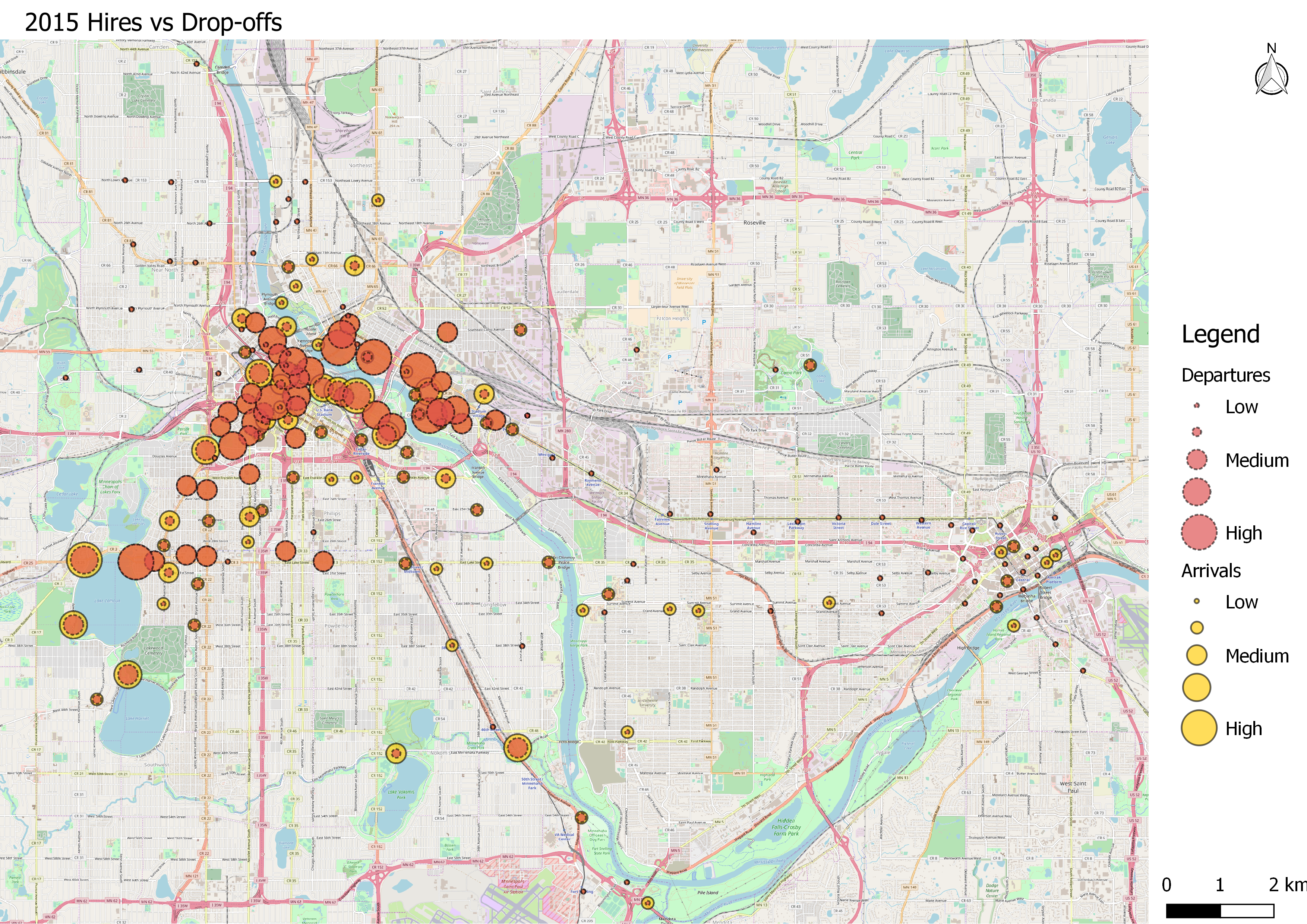 The rebalancing problem is a result of more bikes returning to a station than being hired and where the demand for hires is greater than the demand for arrivals. It is a primary concern for cities with bike share programs including New York, Washington D.C., Portland, and Houston. The problem is visible in the Twin Cities where the yellow circles are larger than the red circles (and vis verses). At these stations, the system was unbalanced in 2015. There are a number of complex solutions to this problem which you can read about here, here, here, and here. One solution for program managers includes, offering incentives in the form of gift cards, free trips, or money that encourage users to drop off/pick up bikes at misbalanced stations.