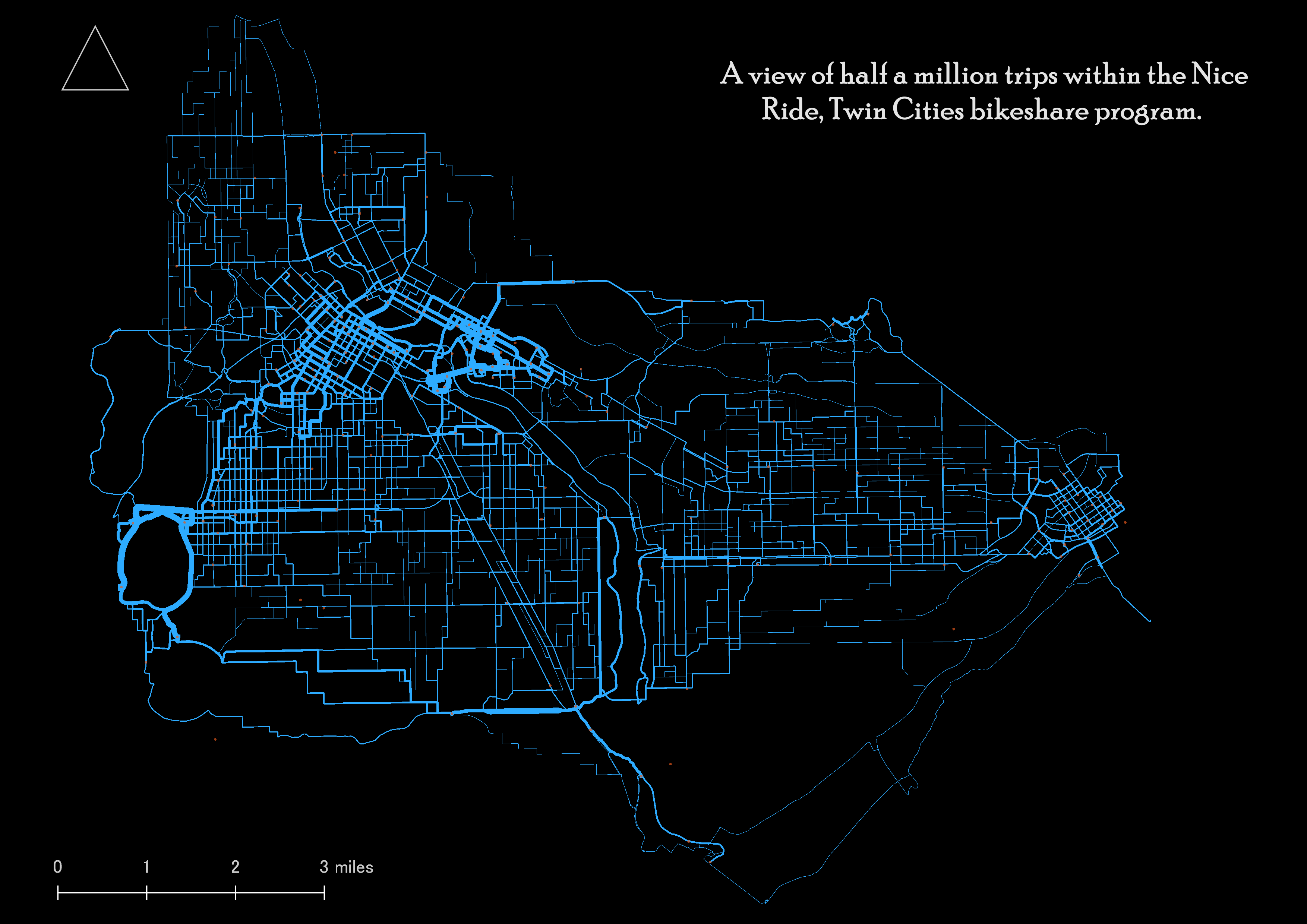 Compared with total member routes visualized above, the AM users were more evenly distributed throughout the city. The downtown Minneapolis area saw more member routes along the downtown streets, which suggests the program enjoys a healthy distribution of users working in the downtown area in addition to university student use.