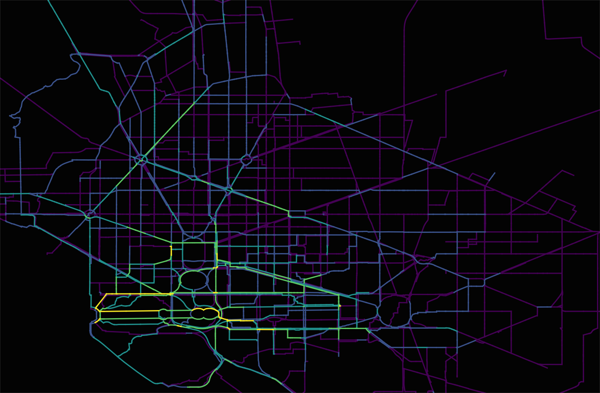 Centrality is an extension of graph theory that seeks to measure the importance of different parts of a network. In this case, centrality will be a measure of road segment popularity. We’ll measure this by the number of times a group of trips are passed through a specific segment using a routing algorithm. There are plenty of fancy ways to configure your routing algorithm, but in this case, I used Dijkstra’s short path on a prioritized network (which is a little fancy, I guess, right?).